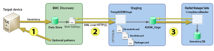 FnmpADDMStage.exeuses the web API to extract the information from BMC Discovery. This method is used because the export process is 100 times faster than using mappings, and there is no requirement to configure custom mappings for each BMC Discovery instance. This executable optionally writes the gathered data into local XML files (available for inspection when required), and (determined by the mode of operation) also writes the data from these XML files into the staging database. - A standard component of FlexNet Manager Suite called a Compliance Reader, executing from the central application server, collects data from the staging database and imports it into the operations databases. This final stage occurs when you run an inventory import to process the incoming inventory.