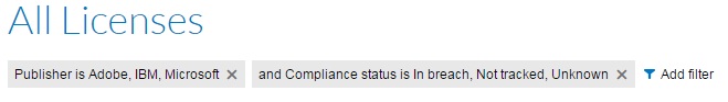 Ihr Manager möchte wissen, bei wie vielen Lizenzen der drei größten Herausgeber Ihr Unternehmen die Compliance-Vorgaben nicht erfüllt. Da der einfache Filter keine Einstellungen für „Ist nicht“ bietet, wählen Sie für Ihren Filter alle Werte außer