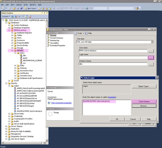 SQL Server Management Studio, and granting the appropriate privileges to the
