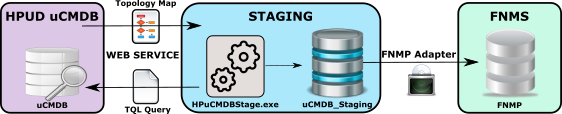 HPUD uCMDB. The retrieved topology maps are stored in a staging database (uCMDB_Staging) present on the staging server. The query execution is performed using the web service interface ofHPUD uCMDB. - FlexNet Manager Suite: The Compliance Reader component residing on this server fetches data from the staging database and loads it into the FlexNet Manager Suite database when you run an inventory import.