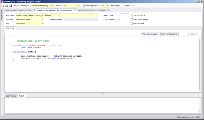 The log message tab shows the results of executing the adapter. This is the same as the command line logging from the Compliance Importer. Look here for error messages. You can get more detail by setting the verbose tracing option on the toolbar.