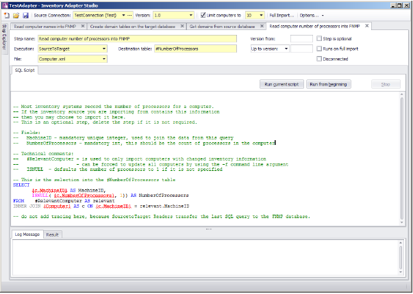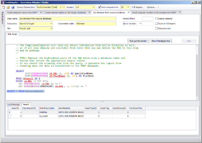 This area contains the SQL scripts that make up the adapter. They are used for gathering data and transferring it to the FlexNet Manager Suite database. The template adapter provided performs all the differential updates required to move the data into the final FlexNet Manager Suite tables. This script tab provides SQL syntax highlighting, and a special red underlined highlight that shows where you need to modify queries with your own data values.