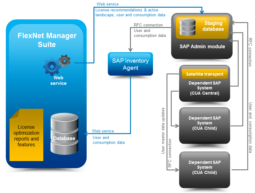 If your SAP landscape uses CUA, you need to specify the CUA central system in the SAP Admin module. When an SAP administrator makes changes to user primary data in the SAP Admin module, FlexNet Manager for SAP Applications sends these changes to the CUA central system, which distributes them to the connected SAP systems.