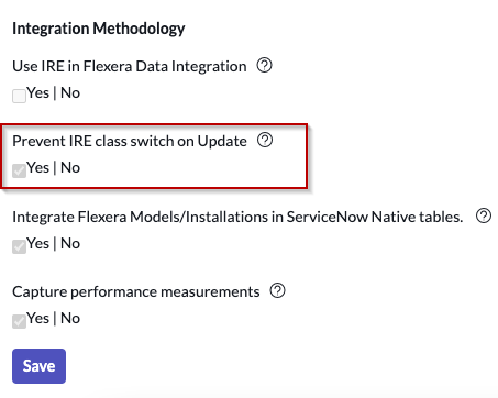 With this release, we have added a new option, called Prevent IRE Class Switch on Update, to Integration Properties under the Integration Methodology heading. This option is on (Yes) by default and prevents the integration from changing the class of existing configuration item (CI) records.