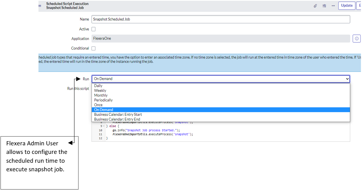 | • | Run this script—Content of script to run at the scheduled date and time. This script has the logic to run the Flexera One IT Visibility API services for different datasets and executes at the time you specify. |