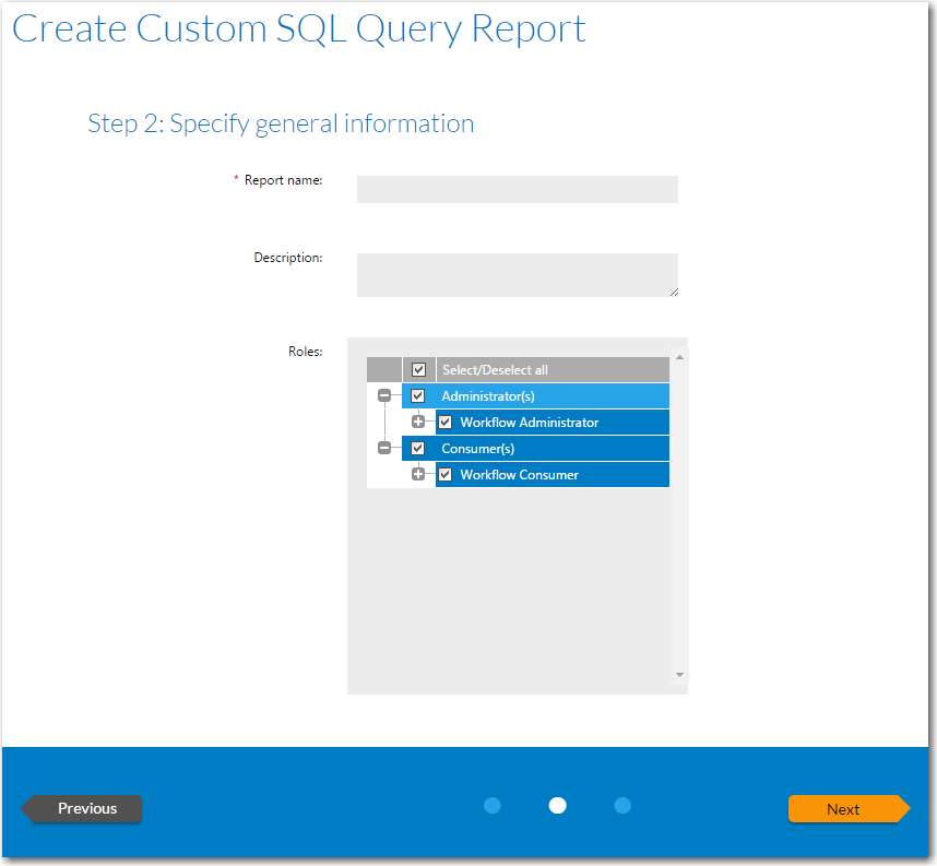 | 4. | Enter a Report name and Description to clearly identify the contents and purpose of this report. This name and description will be listed on the All Reports page. |
