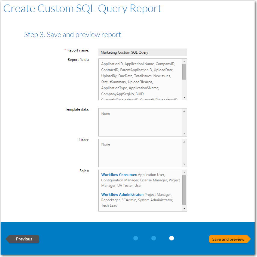 | 6. | Click Next. The Step 3: Save and preview report page opens, which displays all the information needed to create the report. |