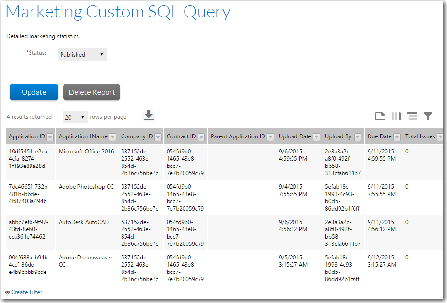 Tip:To assist you in writing queries to retrieve data, see Wildcard Support in Reports SQL Queries.