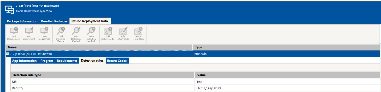 The Detection Rules subtab of the Intune Deployment Data tab of the Home Deployment Type View lists methods to detect whether this package is already installed on the target system.