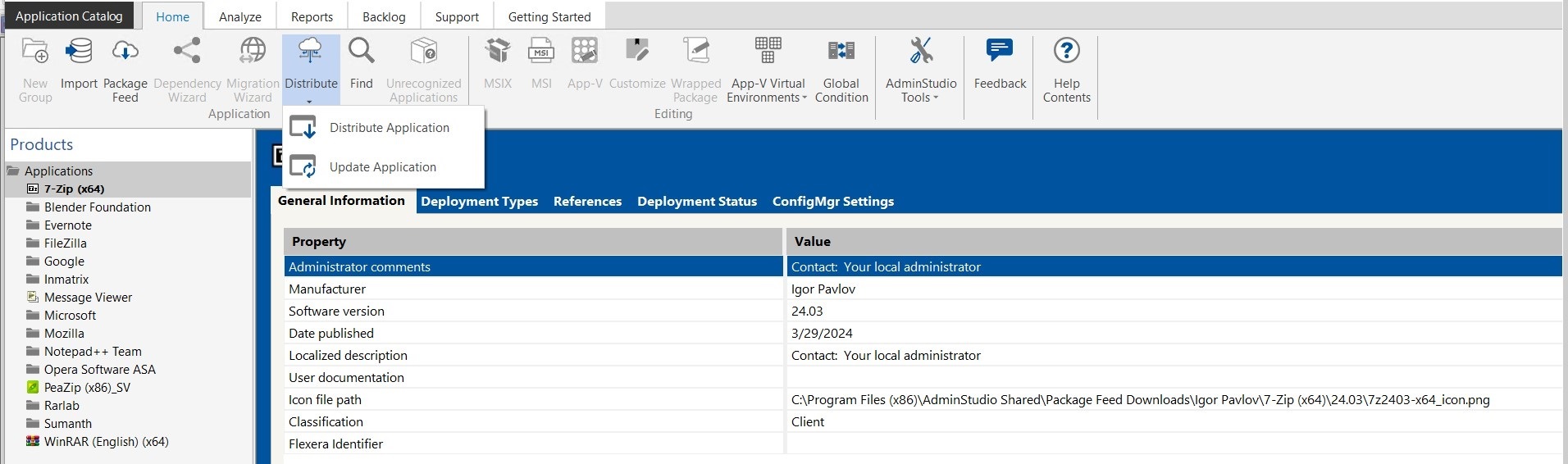 A new Update Application option under Distribute button in the ribbon and a new Update Application context menu for the selected application are added in the Home tab to launch the Update Application Wizard. Use Update Application Wizard to update existing applications to newer versions in the ConfigMgr.