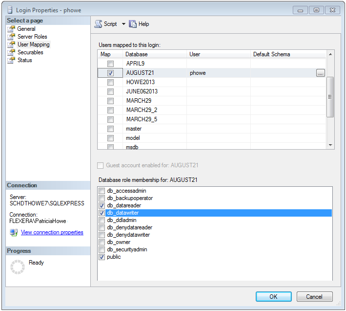 In the Database role membership for: [DatabaseName] list, select db_datareader and db_datawriter. |
