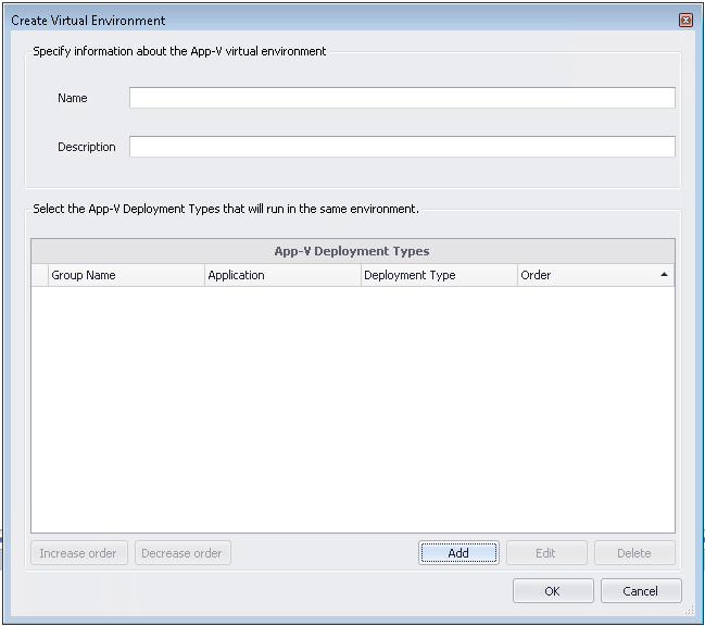 Note:If more than one group is listed on the Create Virtual Environment dialog box, you could use the Increase order and Decrease order buttons to reorder the list. When multiple virtual applications modify the same file system or registry values on a client computer, the application with the highest order will take precedence.