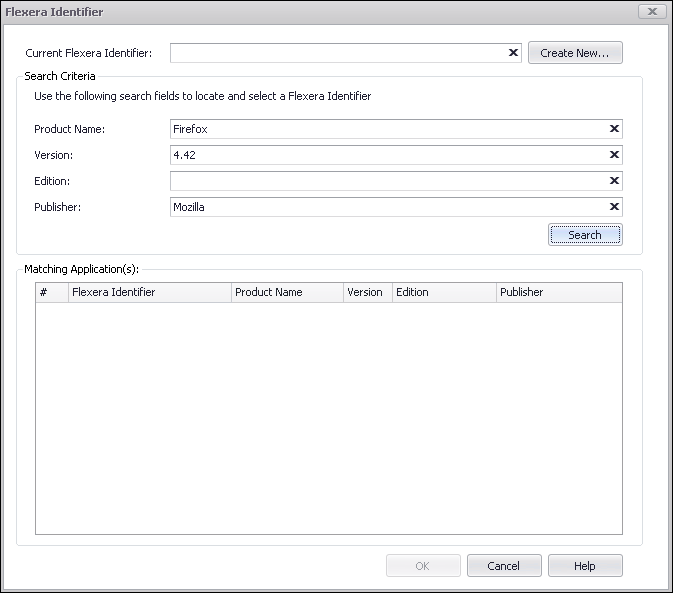 | 3. | Proceed with the steps in Performing a Manual Search for a Flexera Identifier, and if a Flexera Identifier is not found, proceed with the steps in Creating Local Flexera Identifier Entries for Internal or Repackaged Applications. |