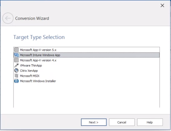 | 2. | On the Target Type Selection panel of the Conversion Wizard, select Microsoft Intune Windows App, and then click Next. |