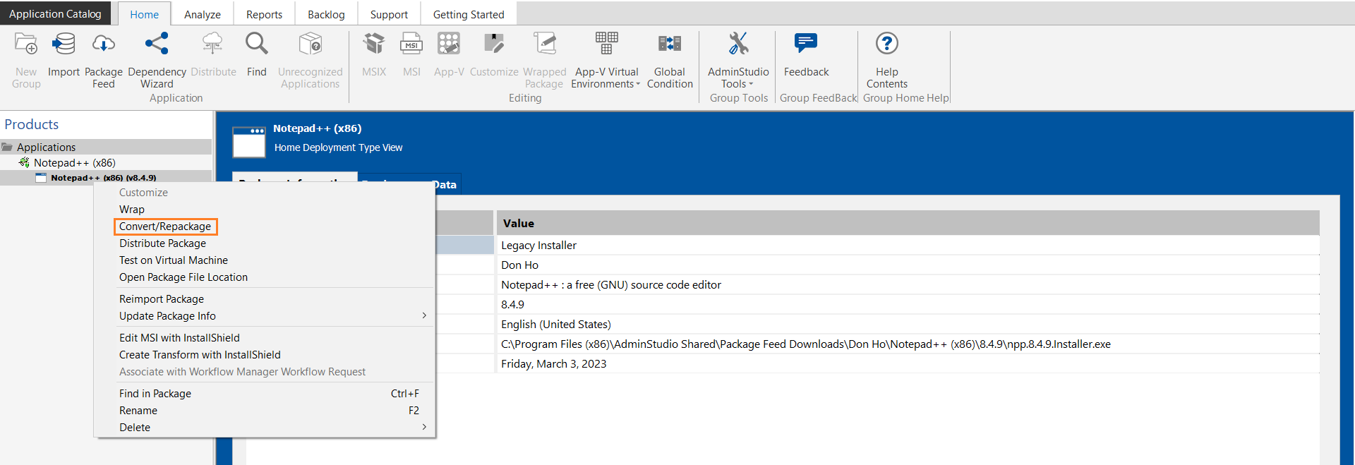 | 1. | In the Applications tree, right-clicking on a package or an application or group of applications, and then select Convert/Repackage from the shortcut menu. |