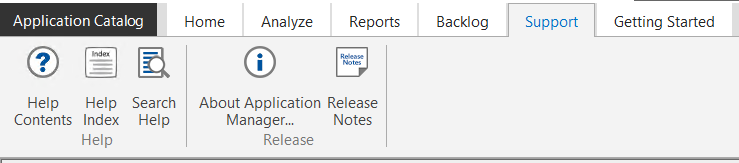 The Support tab of the Application Manager ribbon provides access to the following tasks: