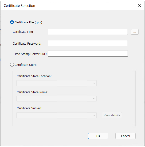 To convert to digital signing, select either the Certificate File (.Pfx) or Certificate Store option. |