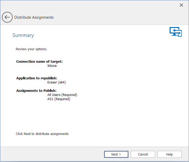 The Summary panel shows a summary of the selected application along with the assignments. When you click Next, the distribution begins.