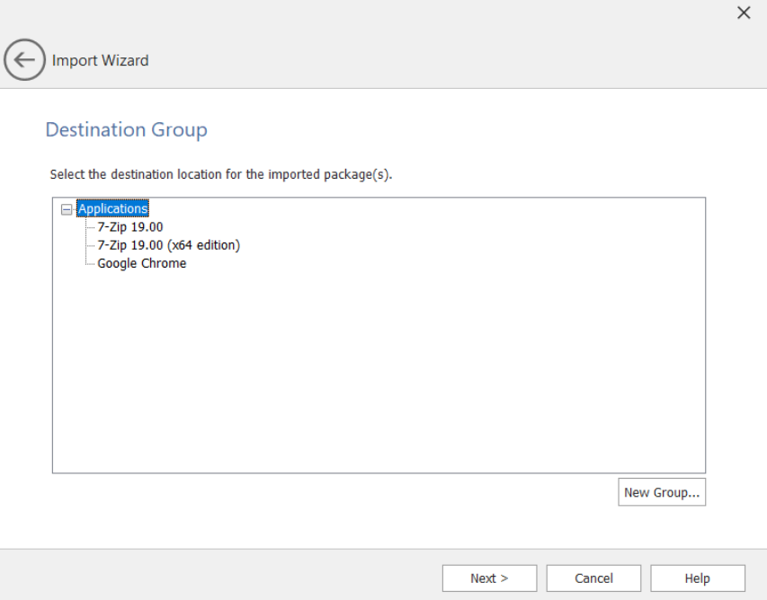 Note:If you launched the Import Wizard by selecting a group in the tree and then clicking Import, that group will be selected by default on the Destination Group panel