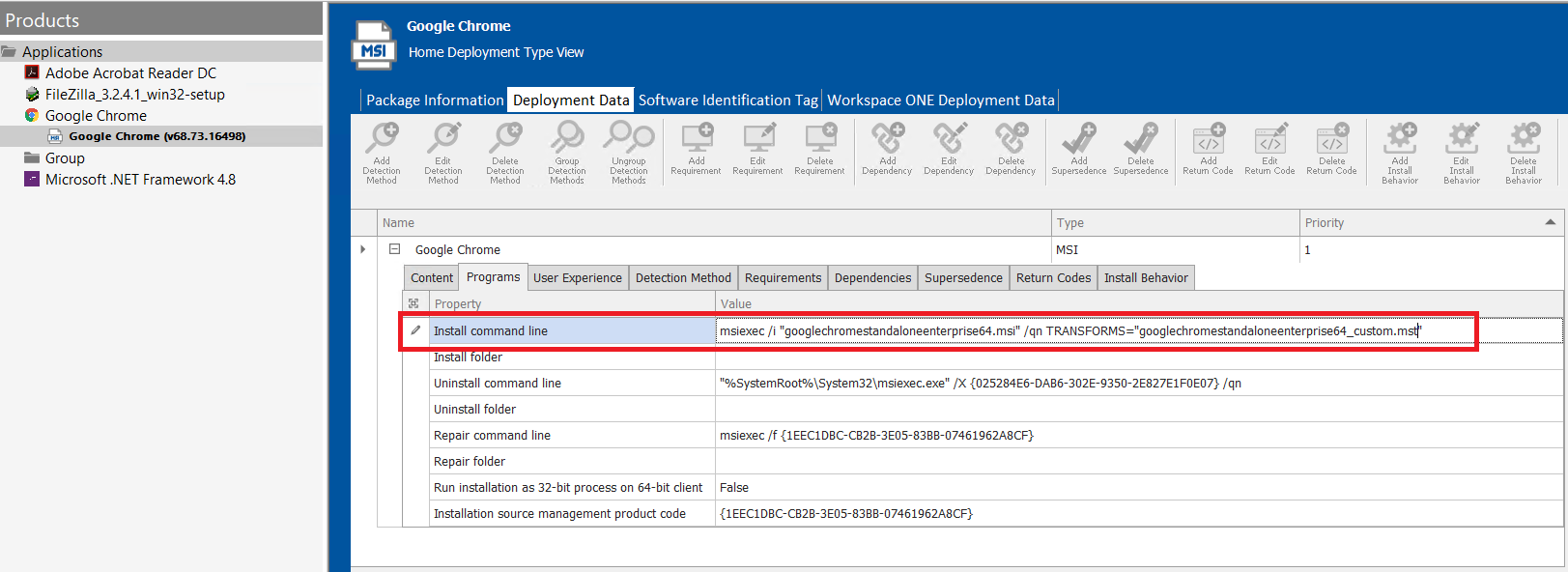 Note:On successful import of an application into the Application Catalog Tree, you can see the Install Command line and Uninstall Command Line for the selected application in Deployment Data >> Programs >> Install Command Line and Uninstall Command Line.