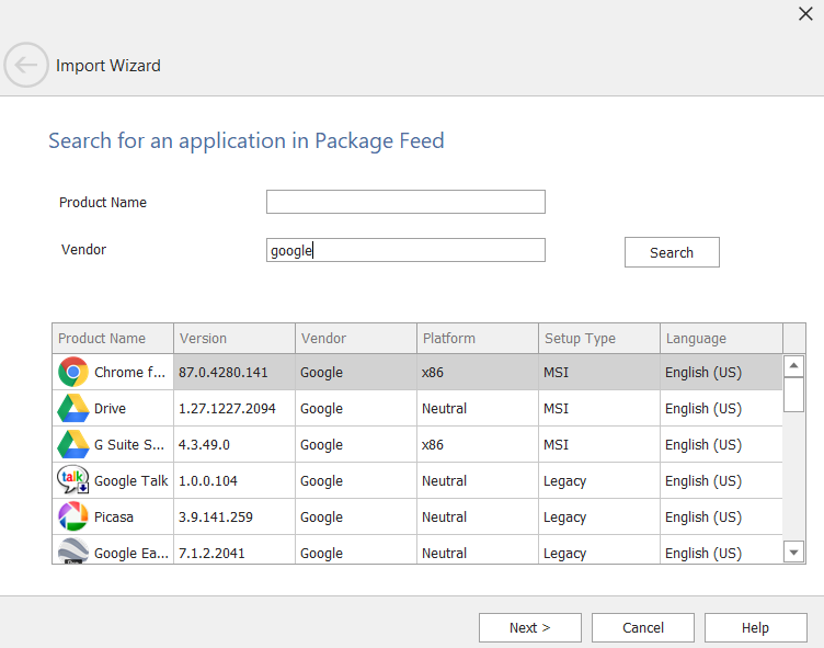 9. | Click Next. When using the Package Feed Module, dynamic custom panels will appear in the Import Wizard based on the settings defined for each package. For example, when importing the Google Chrome package, several dynamic custom panel will appear, including the Options panel. |