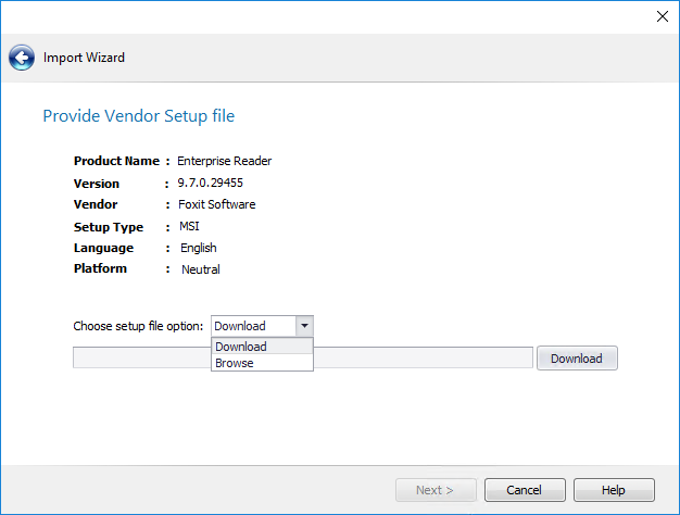 7. | When you have finished downloading the setup file to the package feed configured download path, click Next. The Silent Command Line Arguments panel loads. |