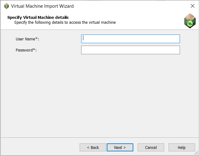 On the Specify Virtual Machine details panel, enter the user name and password to use to access the virtual machines you selected on the Select Virtual Machines panel.