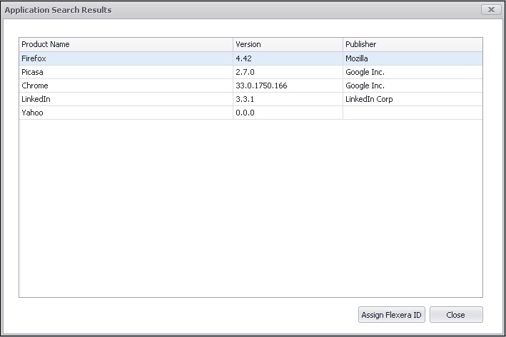 The Application Search Results dialog box opens, listing all applications in the Application Catalog that do not have an associated Flexera Identifier.
