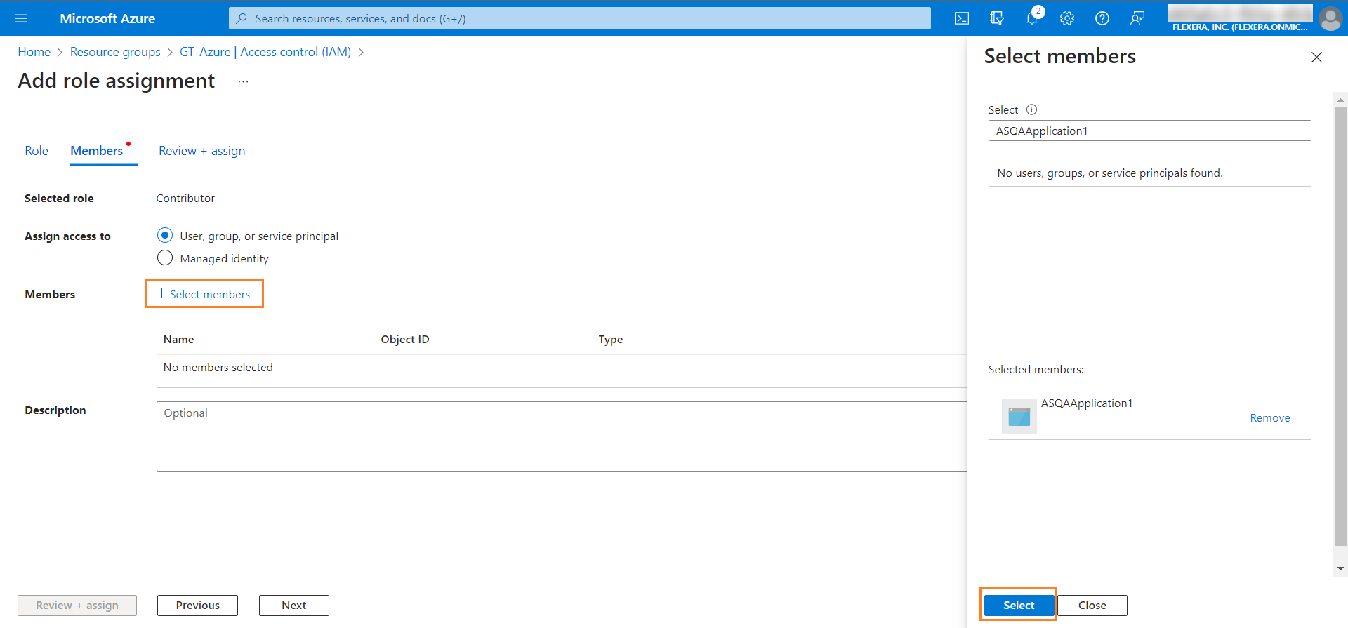 6. In the Members tab, click on + Select members link. A small dialog box appears on the right side.