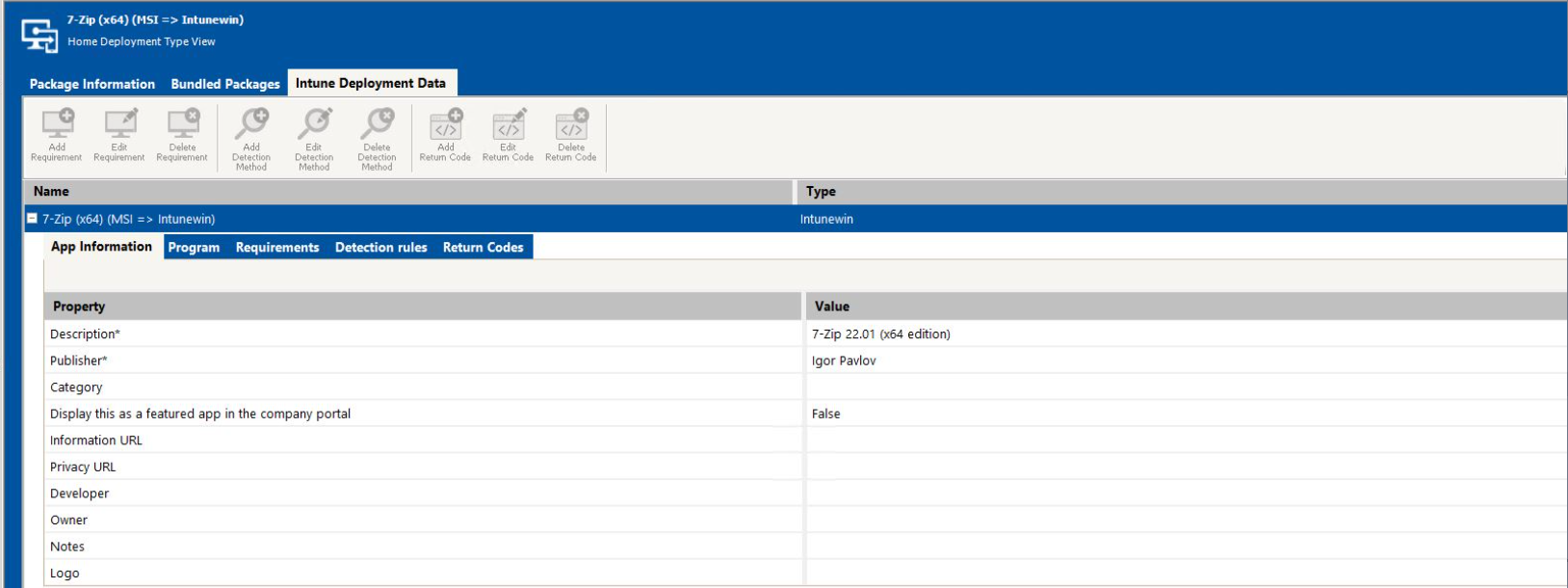 The App Information subtab of the Intune Deployment Data tab of the Home Deployment Type View lists general information about package.