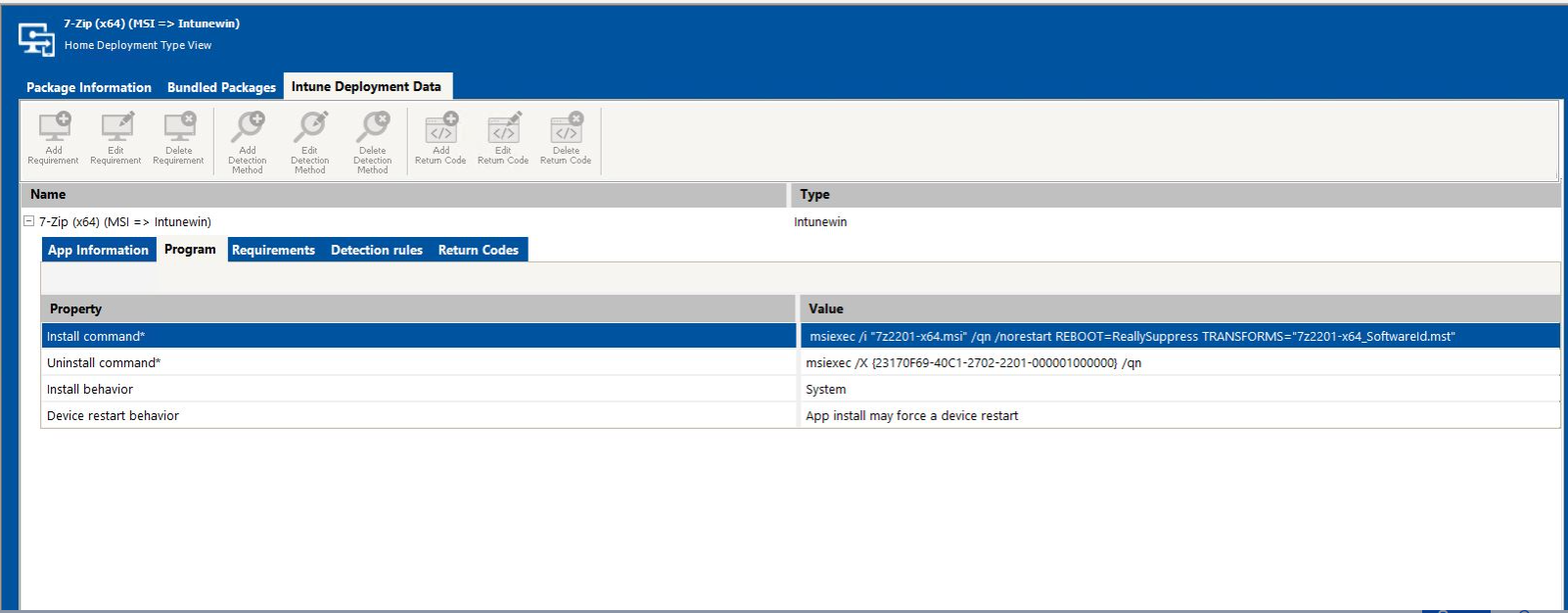 The Program subtab of the Intune Deployment Data tab of the Home Deployment Type View lists command line parameters for package installation and uninstallation.