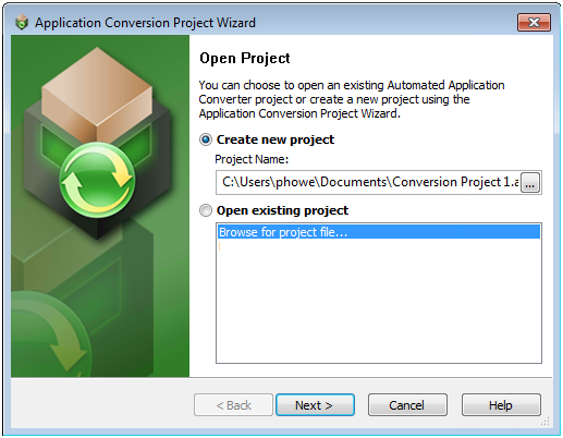 Launch Automated Application Converter. The Open Project dialog box opens. |