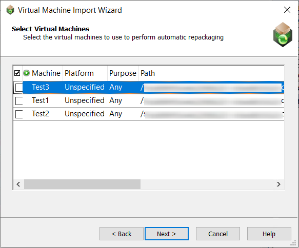 On the Select Virtual Machines panel, select the virtual machine images that you want to use to perform automated repackaging. |