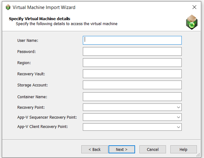 Based upon your selection on the Select Virtual Machine Source panel, enter the following information: |
