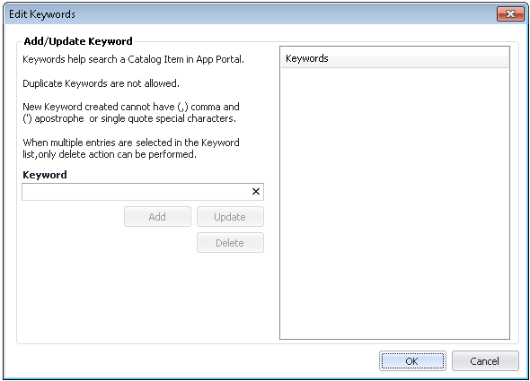 Note:When you add a keyword on the Edit Keywords dialog box, it will be available to assign to any application in this Application Catalog.