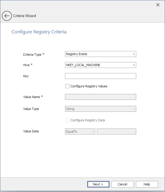 Enter the registry value name that you are using in this criteria. This field is enabled only when the Configure Registry Values check box is selected. |