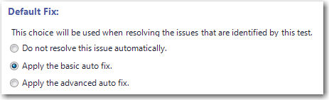 For some of the tests in the Operating System Compatibility test group, you have the option of specifying how you want Application Catalog to resolve automatically resolvable issues. You can instruct Application Catalog to perform the basic auto fix, the advanced auto fix, or not to fix issues generated by the test.
