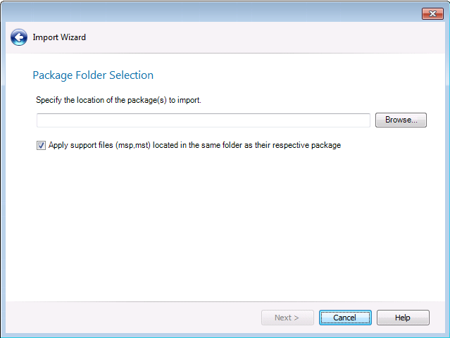 | 6. | Optionally, if you also want to import package support files (such as transforms or patch files), select the Apply support files (.msp, .mst) located the same folder as their respective package option. |