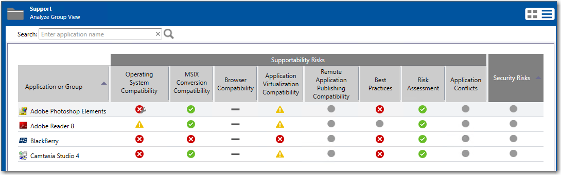 | 5. | When issue resolution and reimporting is complete, look at the Analyze Group View, Application View, or Deployment Type View of the package, application, or group that you tested. You will see that the Error With Fix and Warning With Fix icons have been replaced with the status icon with the next highest level (as described in Hierarchical Level of Status Icons) in that test category. |