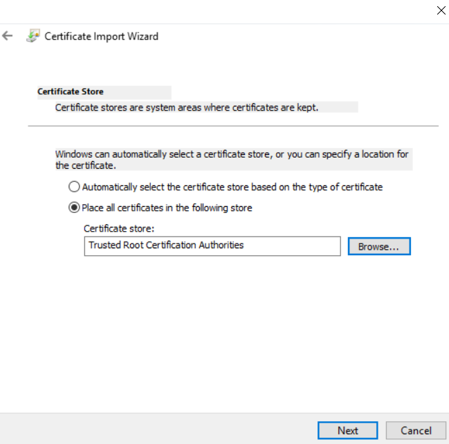 5. In the Certificate Store page, select Place all Certificate in the following store radio button. The Certificate Store field appears, browse and select the folder were you want to install the certificate. Click Next.