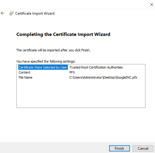 6. Click Finish to import the certificate.