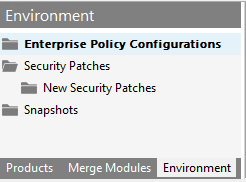 | 2. | Click on the Environment tab. The tree lists the Security Patches, OS Snapshots, and Enterprise Policy Configuration files that have already been imported into the Application Catalog. |