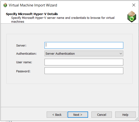 On the Select Virtual Machines from a Microsoft Hyper-V Server panel, you enter a server name and the login information to connect to a Microsoft Hyper-V Server.