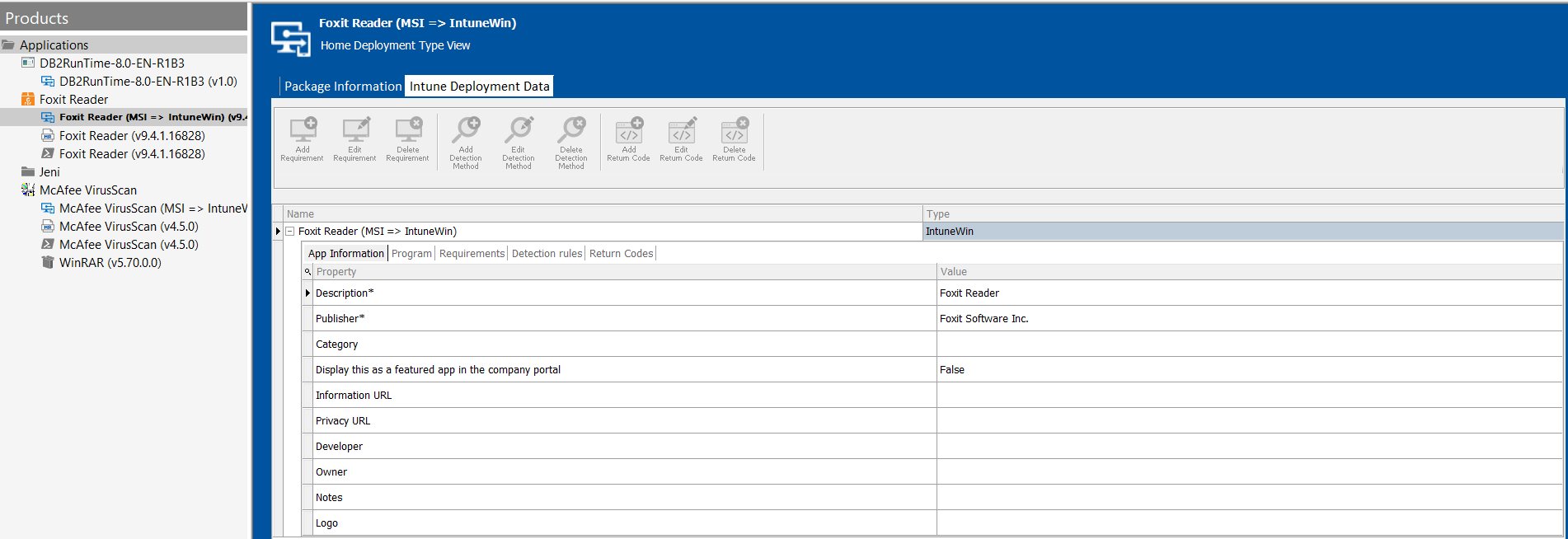 AdminStudio supports publishing of MSI, MSIX and Intunewin package types to Microsoft Intune. The Intune Deployment Data tab appears only for the supported package types. The Intune Deployment Data Tab displays various deployment related properties organized in subtabs for easy navigation. You can view and edit properties values either inline or by using the easy-to-using wizards in Detection rules, Requirements and Return code subtabs.