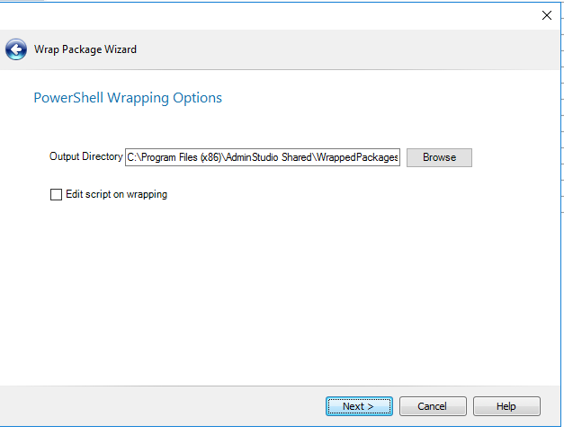 On the PowerShell Wrapping Options panel of the Wrap Package Wizard, you need to specify the Output Directory, the location where the PowerShell-wrapped package will be stored.