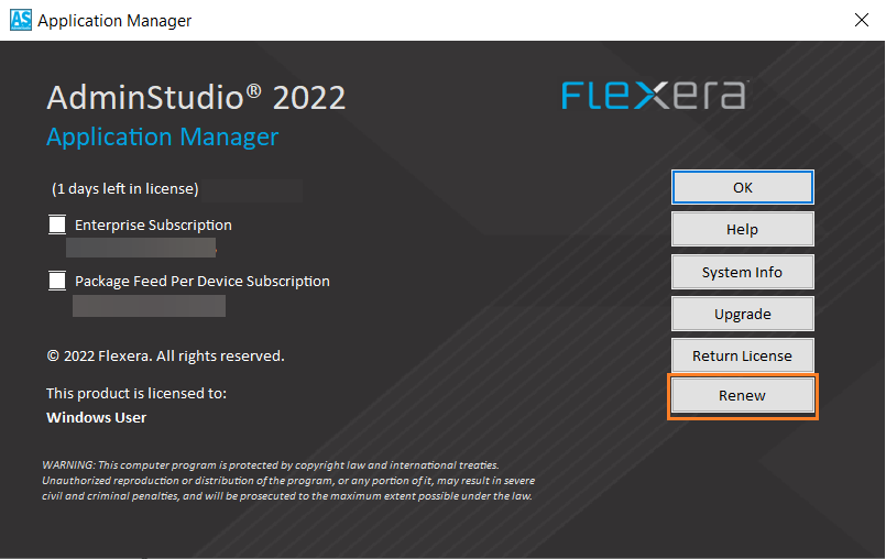 Note:The automatic reactivation is applicable only if you have previously activated AdminStudio using an activation code. If a license file was previously used for activation, then a new license file needs to be generated for the new subscription end date from the Product and License Center.
