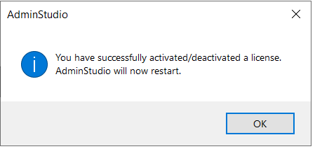 | 4. | Click OK and confirm the popup for activation process. Upon clicking OK button, the AdminStudio will now restart. |