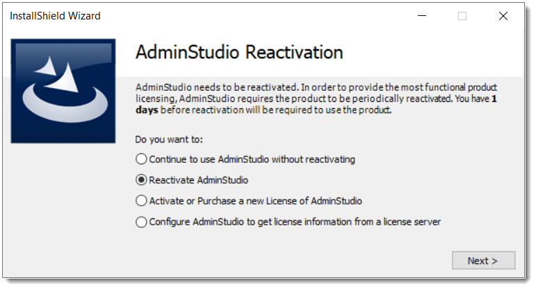 | 2. | Select Reactivate AdminStudio and click Next. |