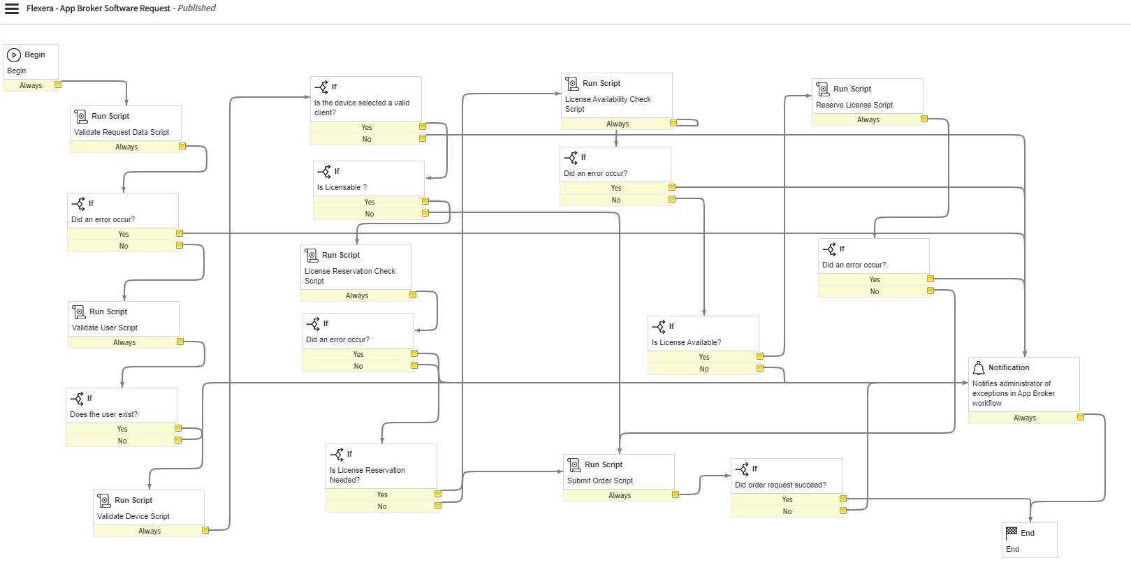 This Flexera - App Broker Cloud Software Request workflow enables ServiceNow to perform advanced license checks, reserve available licenses, and perform automated software delivery to multiple device types. The following flowchart displays the Flexera - App Broker Cloud software request workflow.