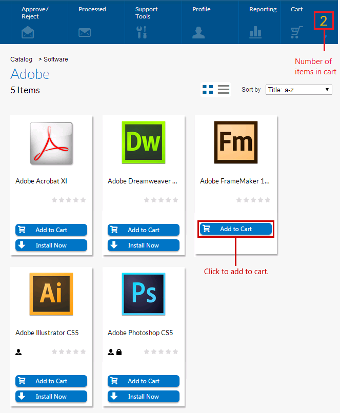 | 2. | Once you locate the item, begin the checkout process by clicking the Add to Cart button in the catalog item card. When an item is added to the shopping cart, the cart count will increase. |